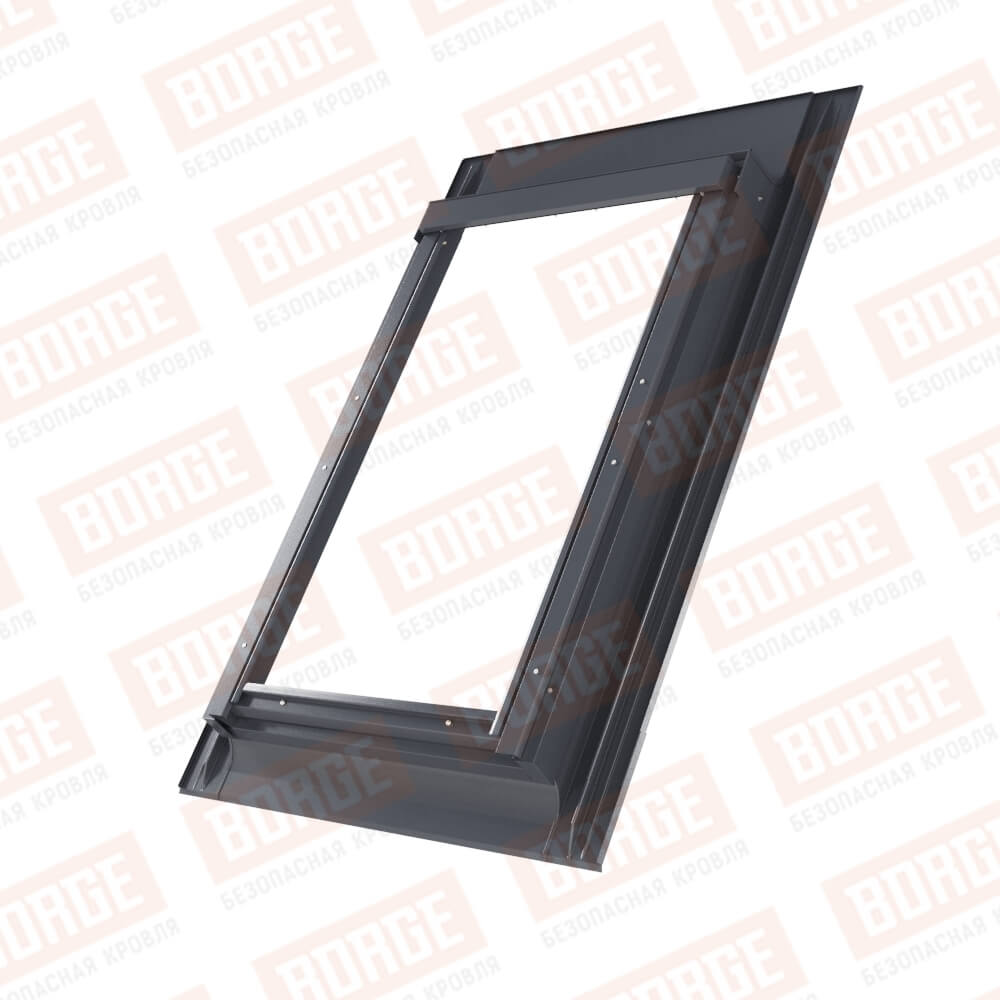 Оклад выполнен из алюминия, окрашен в серый цвет RAL 7024. Модель оклада подбирается в соответствии с размером окна и в зависимости от вида кровельного покрытия.